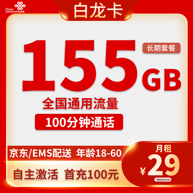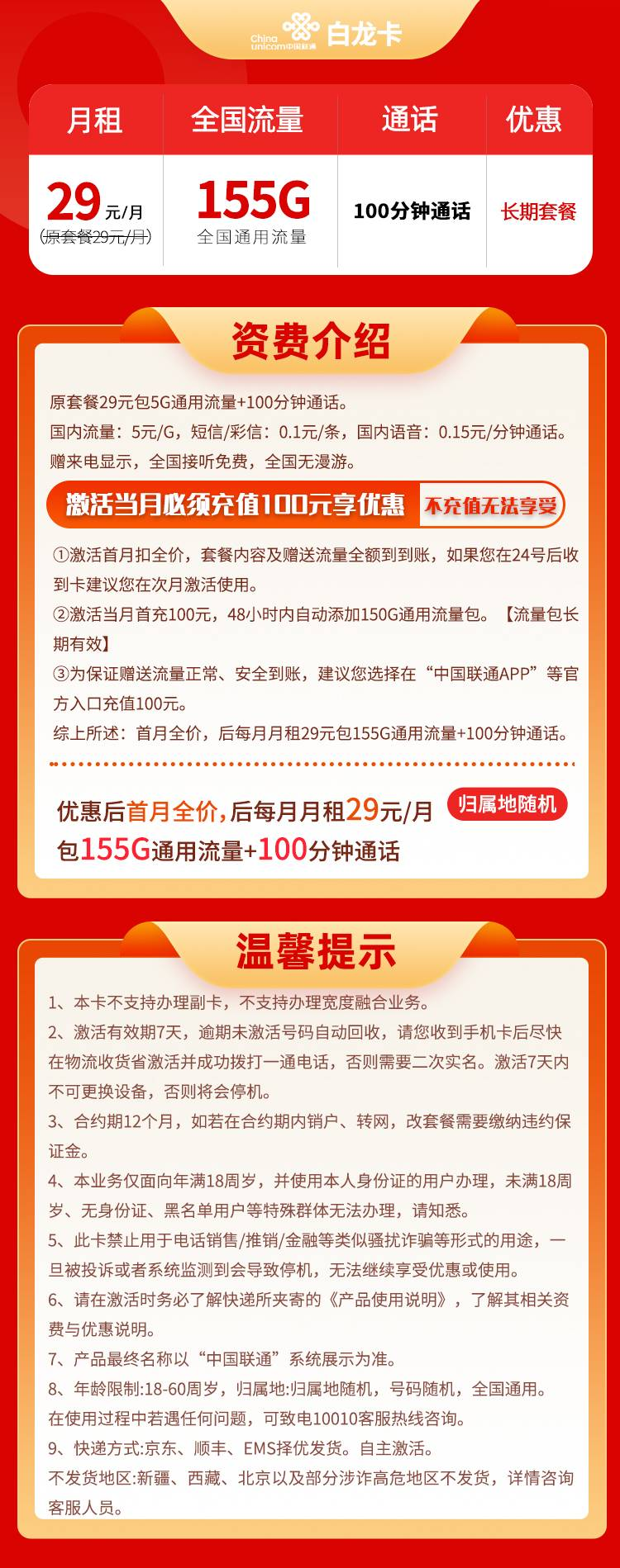 综上所述:首月全价,后每月月租29元包155G通用流量+100分钟通话。