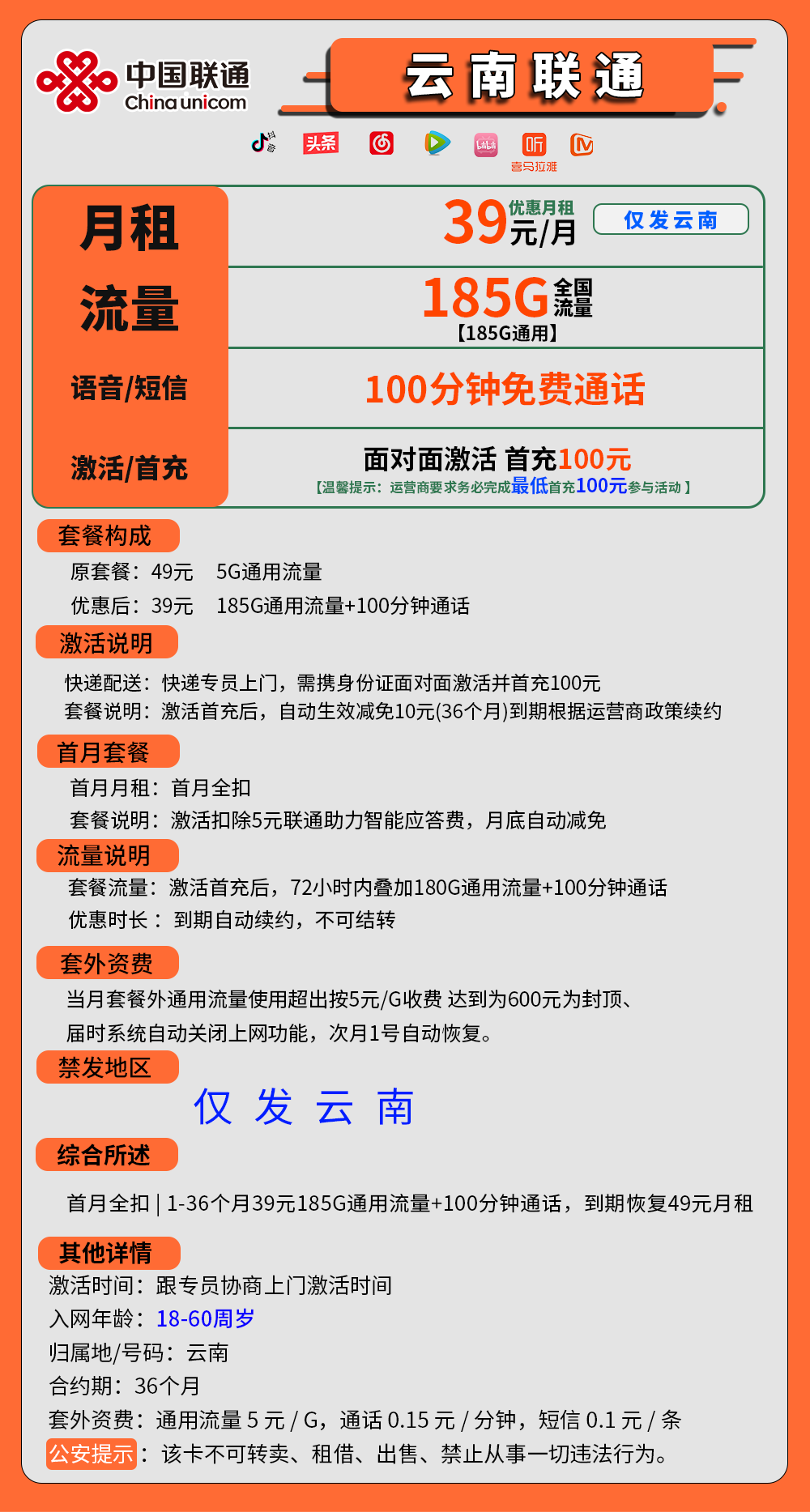 快递配送:快递专员上门,需携身份证面对面激活并首充100元套餐说明:激活首充后,自动生效减免10元(36个月)到期根据运营商政策续约