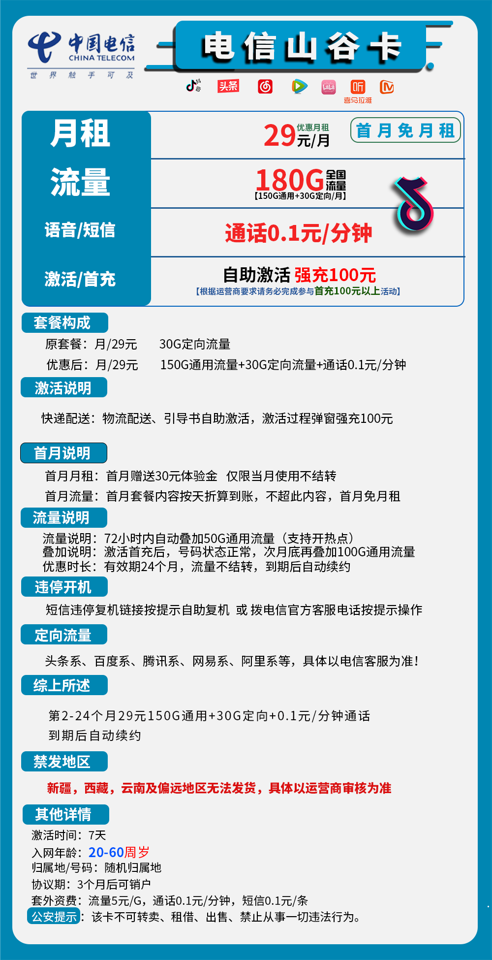 优惠后:月/29元150G通用流量+30G定向流量+通话0.1元/分钟