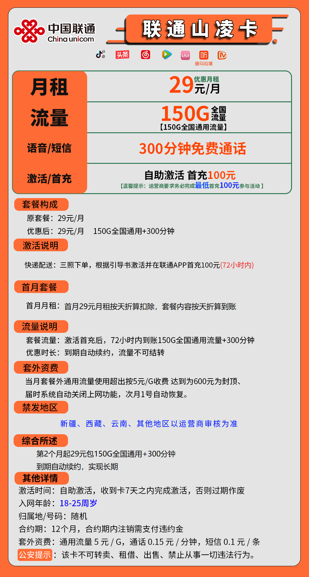 套餐流量:激活首充后,72小时内到账150G全国通用流量+300分钟优惠时长:到期自动续约,流量不可结转