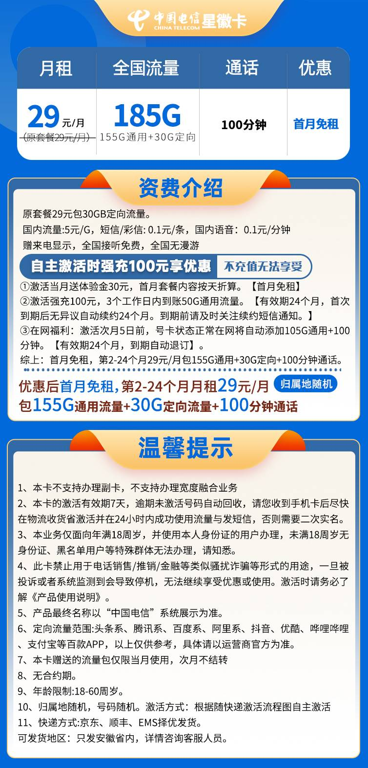 综上:首月免租,第2-24个月29元/月包155G通用+30G定向+100分钟通话。