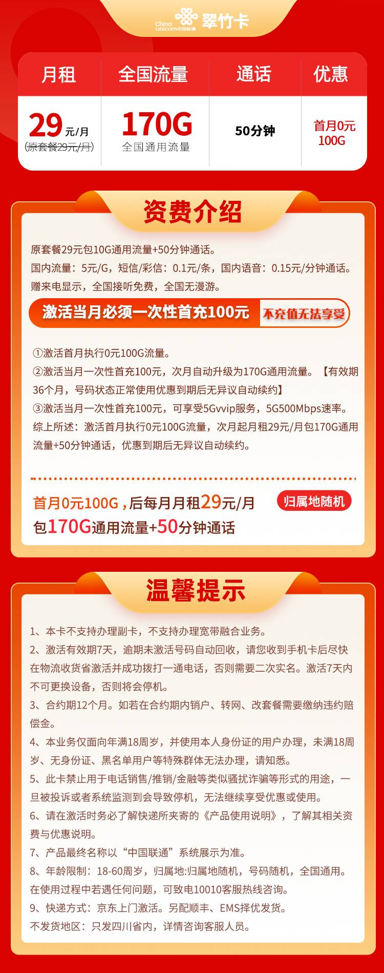 综上所述:激活首月执行0元100G流量,次月起月租29元/月包170G通用流量+50分钟通话,优惠到期后无异议自动续约。