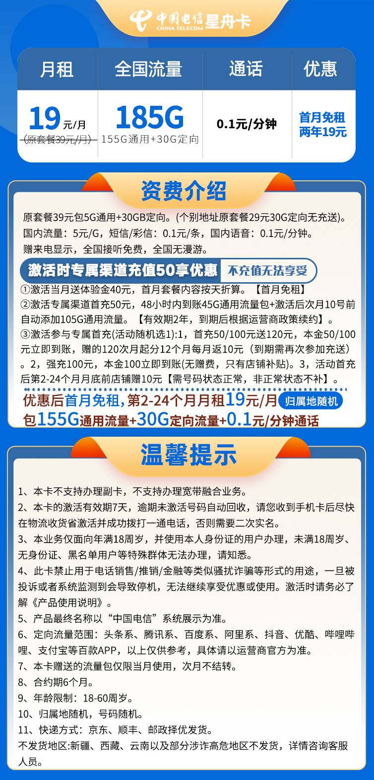 ②激活专属渠道首充50元,48小时内到账45G通用流量包+激活后次月10号前自动添加105G通用流量。【有效期2年,到期后根据运营商政策续约】。