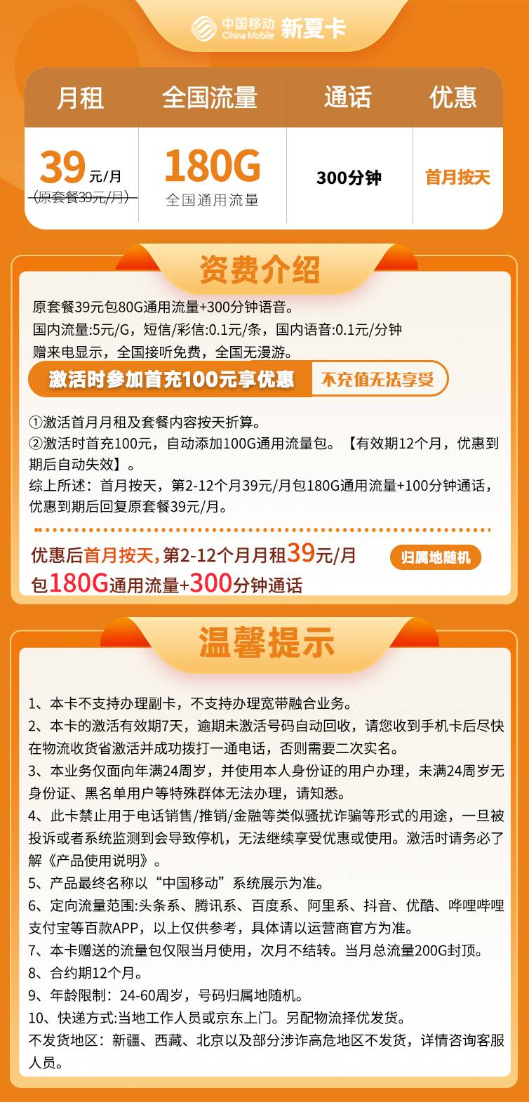 综上所述:首月按天,第2-12个月39元/月包180G通用流量+100分钟通话,优惠到期后回复原套餐39元/月。
