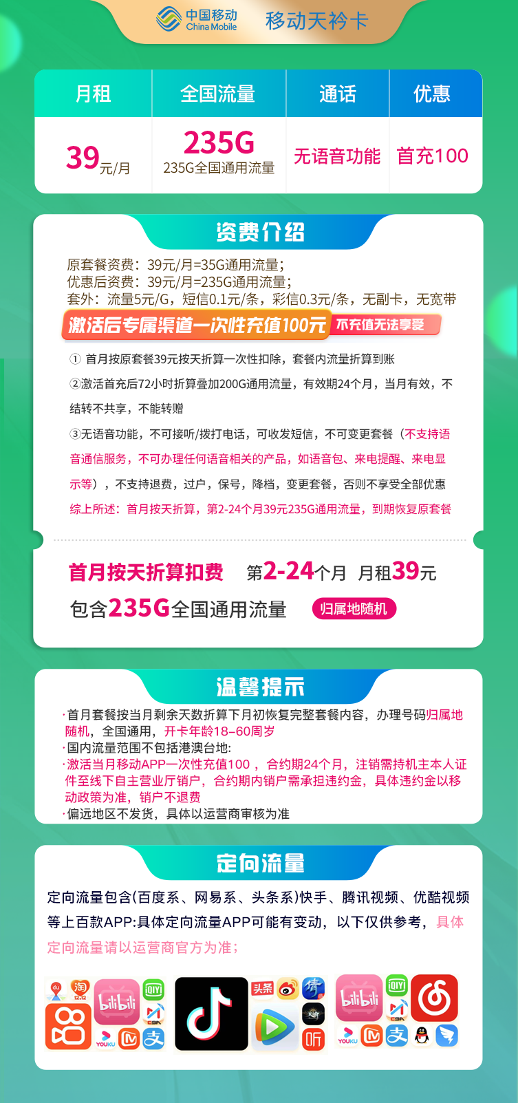 原套餐资费:39元/月=35G通用流量;优惠后资费:39元/月=235G通用流量;套外:流量5元/G,短信0.1元/条,彩信0.3元/条,无副卡,无宽带