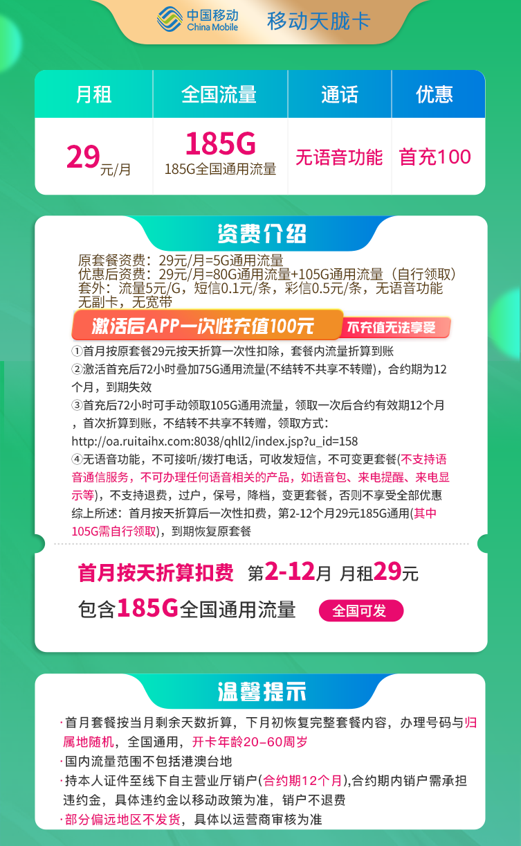 资费:29元/月=80G通用流量+105G通用流量(自行领取)套外:流量5元/G,短信0.1元/条,彩信0.5元/条,无语音功能无副卡,无宽带