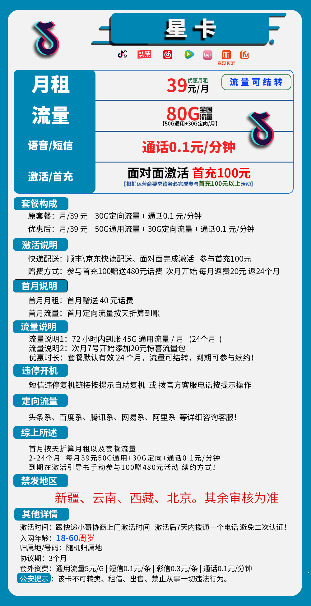 快递配送:顺丰\京东快读配送、面对面完成激活参与首充100元赠费方式:参与首充100赠送480元话费 次月开始每月返费20元返24个月