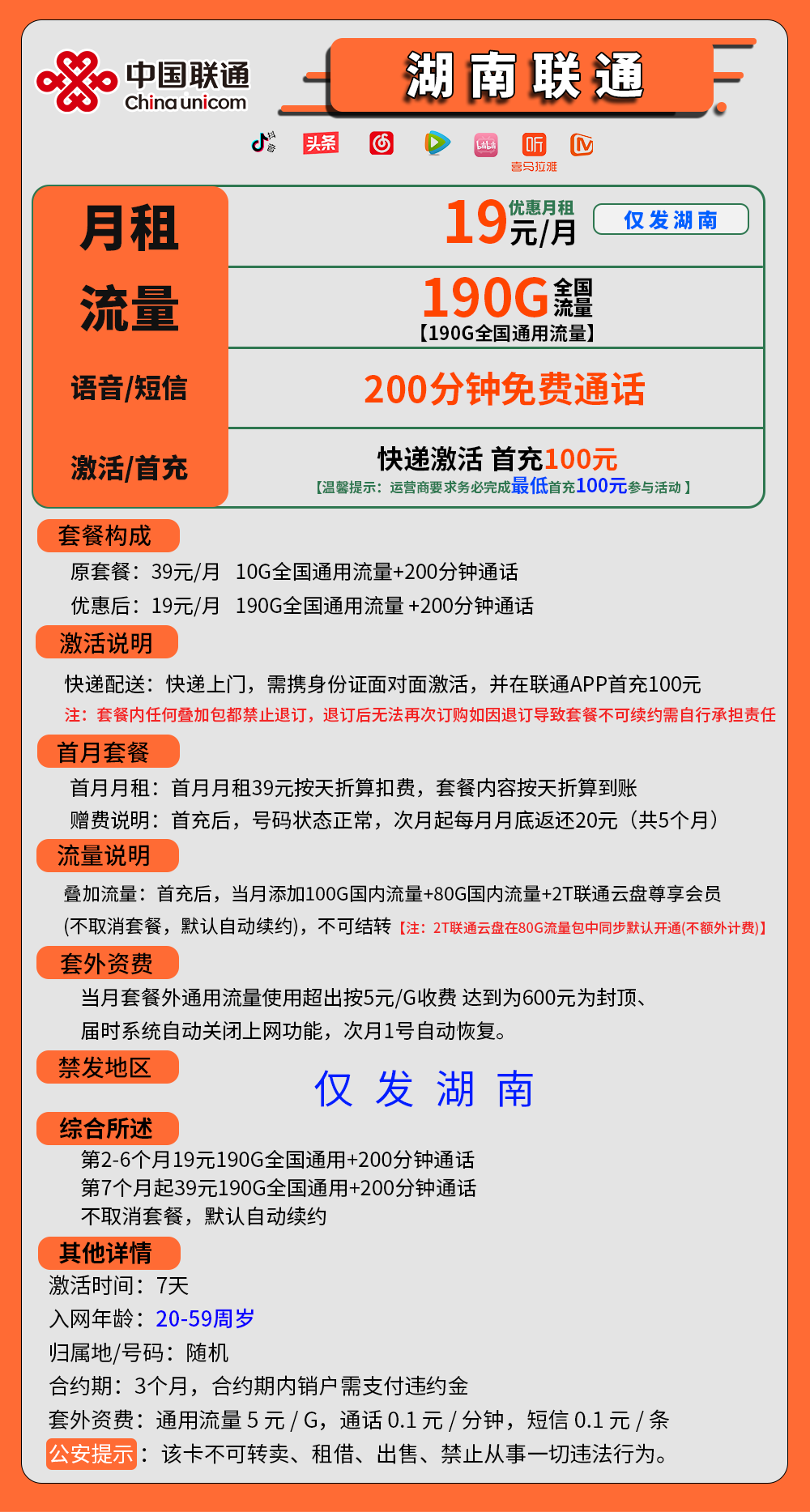 原套餐:39元/月10G全国通用流量+200分钟通话优惠后:19元/月 190G全国通用流量+200分钟通话