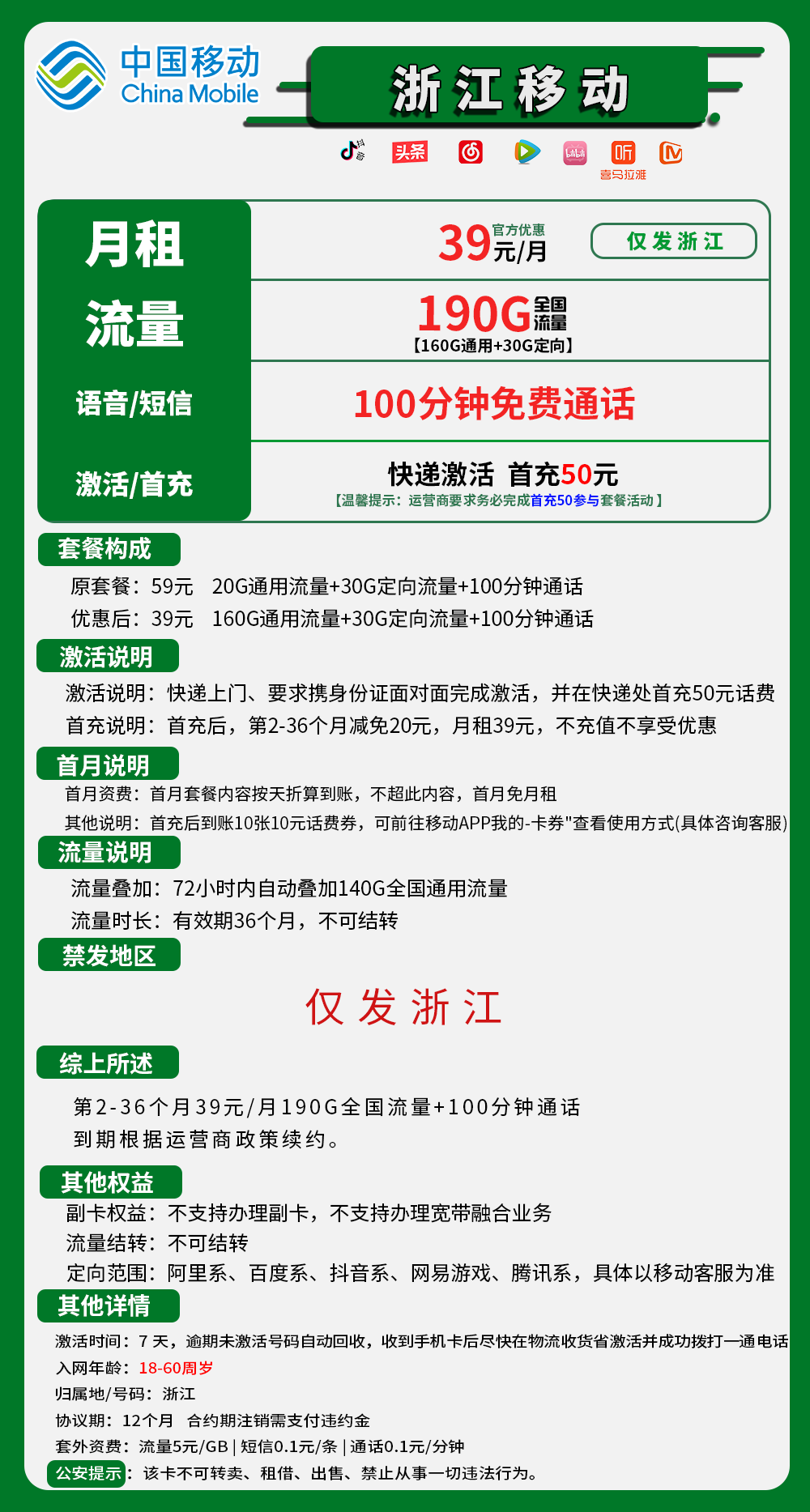 激活说明:快递上门、要求携身份证面对面完成激活,并在快递处首充50元话费首充说明:首充后,第2-36个月减免20元,月租39元,不充值不享受优惠
