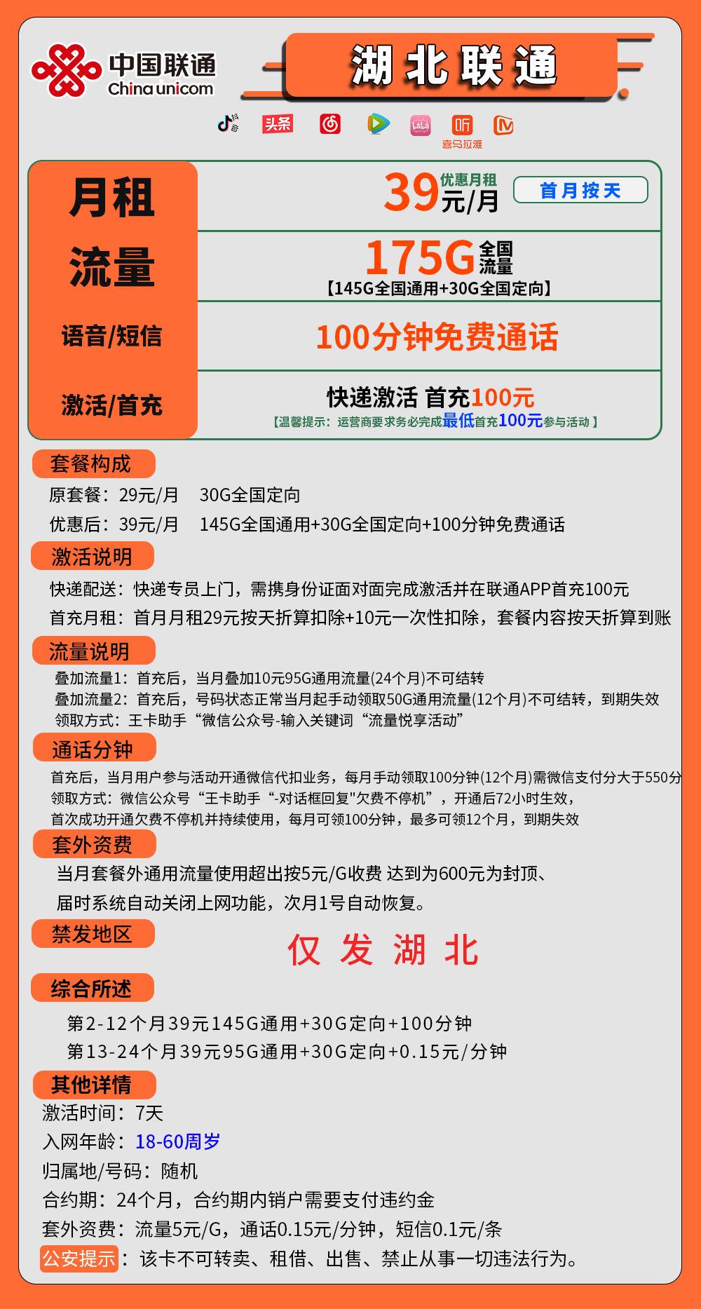 优惠后:39元/月145G全国通用+30G全国定向+100分钟免费通话