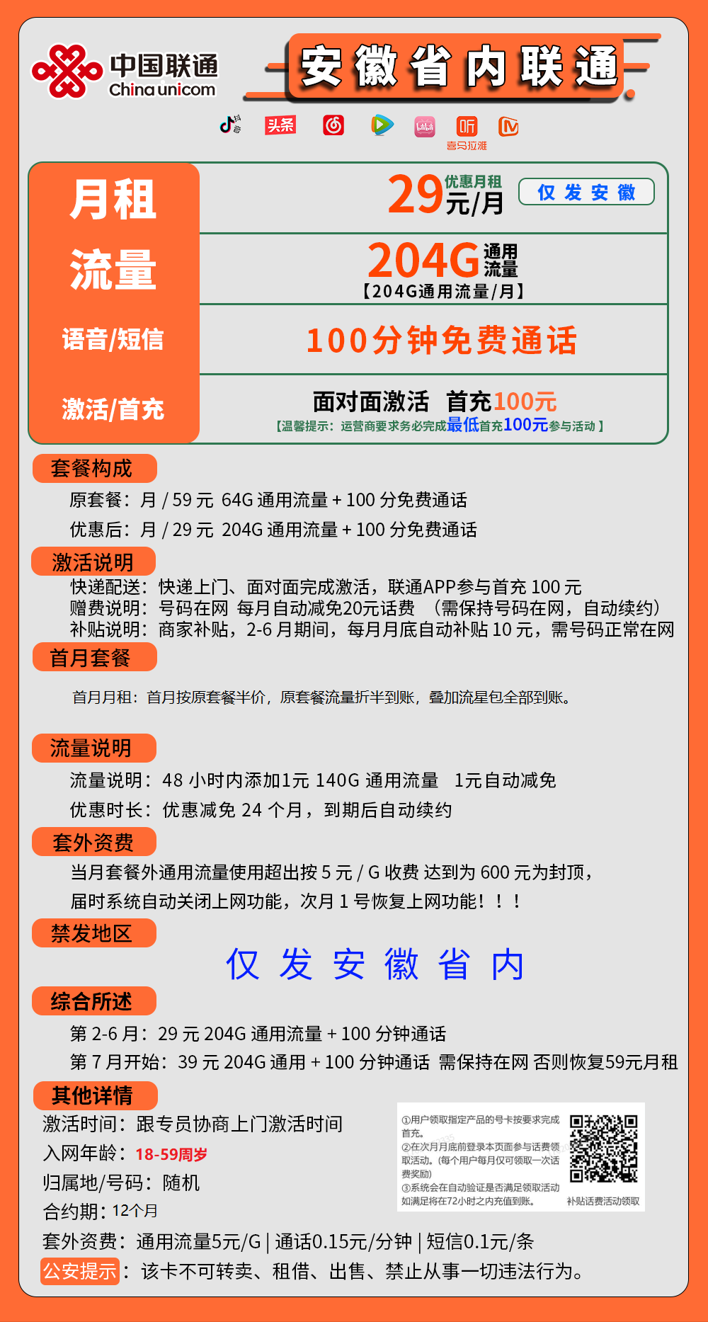 原套餐:月/59元64G通用流量+100分免费通话优惠后:月/29元 204G通用流量+100分免费通话
