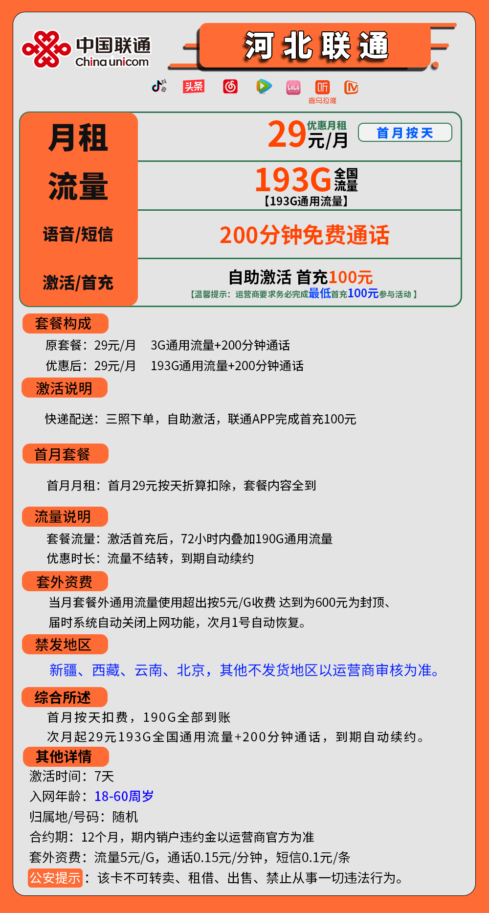 首月月租:首月29元按天折算扣除,套餐内容全到