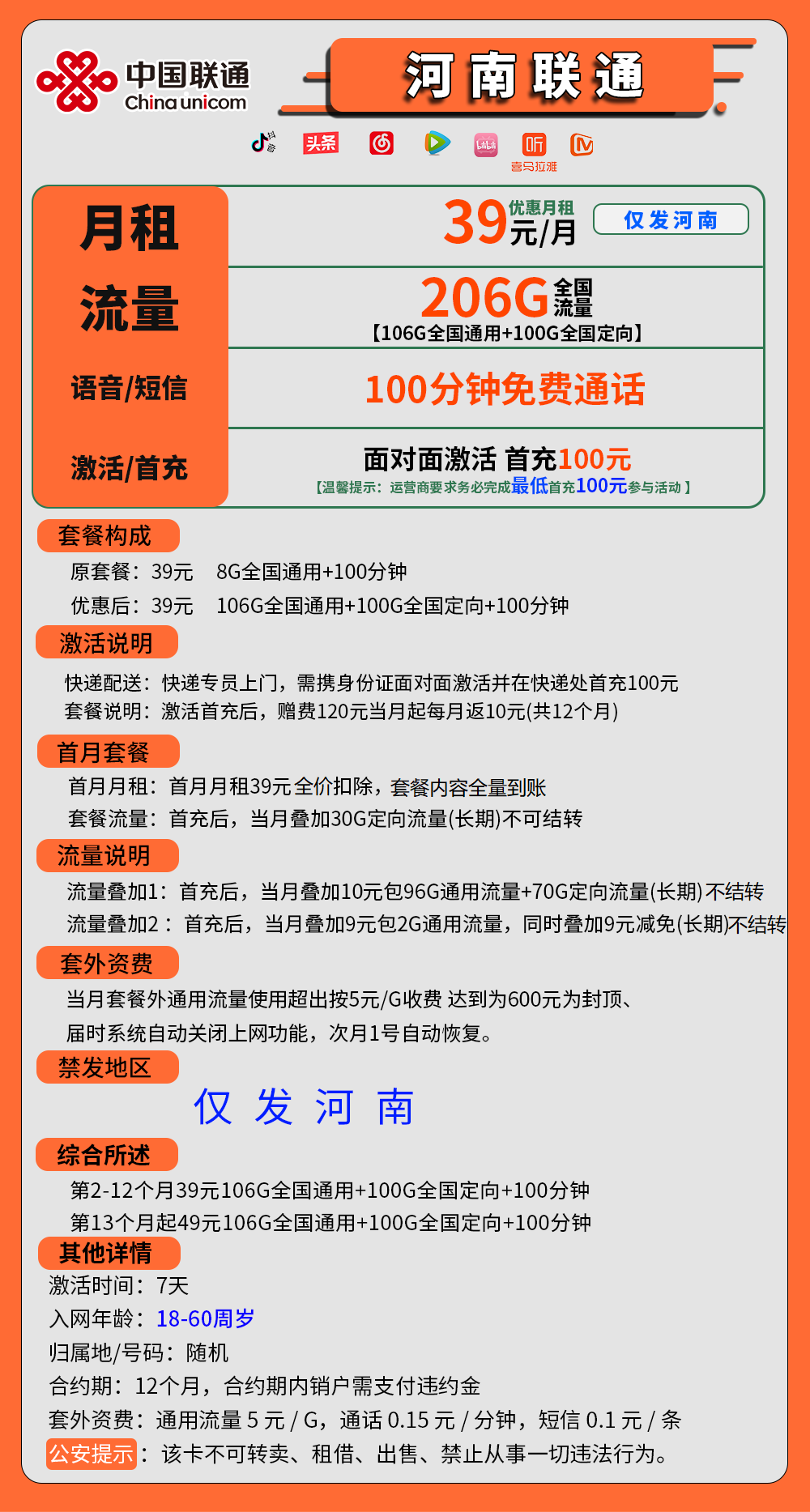 首月月租:首月月租39元全价扣除,套餐内容全量到账套餐流量:首充后,当月叠加30G定向流量(长期)不可结转