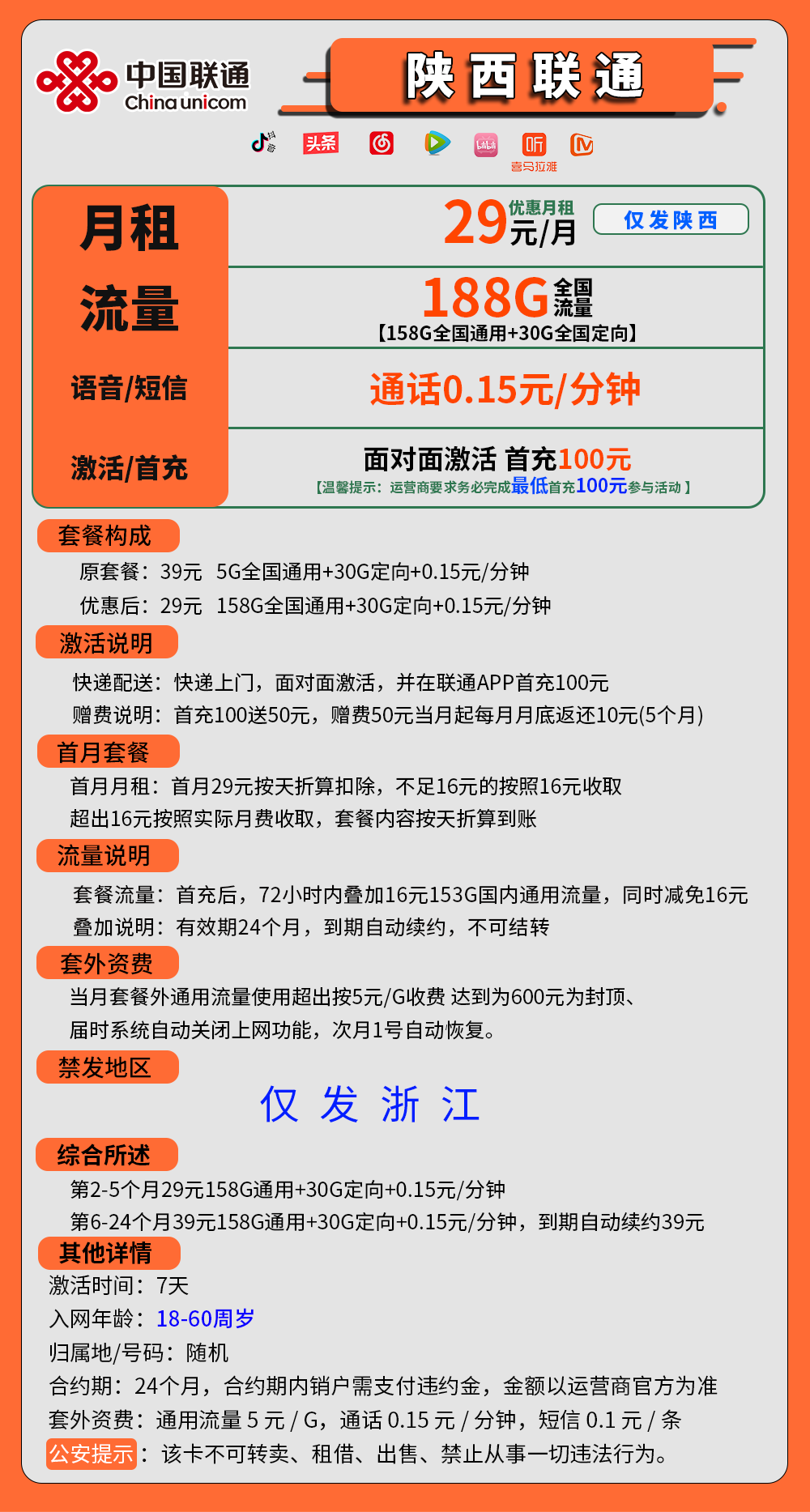 首月月租:首月29元按天折算扣除,不足16元的按照16元收取超出16元按照实际月费收取,套餐内容按天折算到账