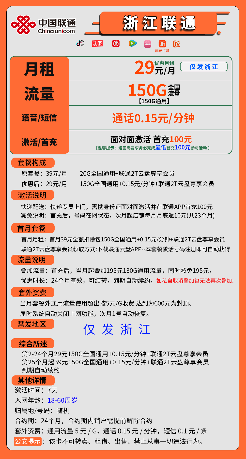 首月月租:首月39元全额扣除包150G全国通用+0.15元/分钟+联通2T云盘尊享会员联通2T云盘尊享会员领取方式:下载联通云盘APP--本套餐激活号码注册即可自动获得