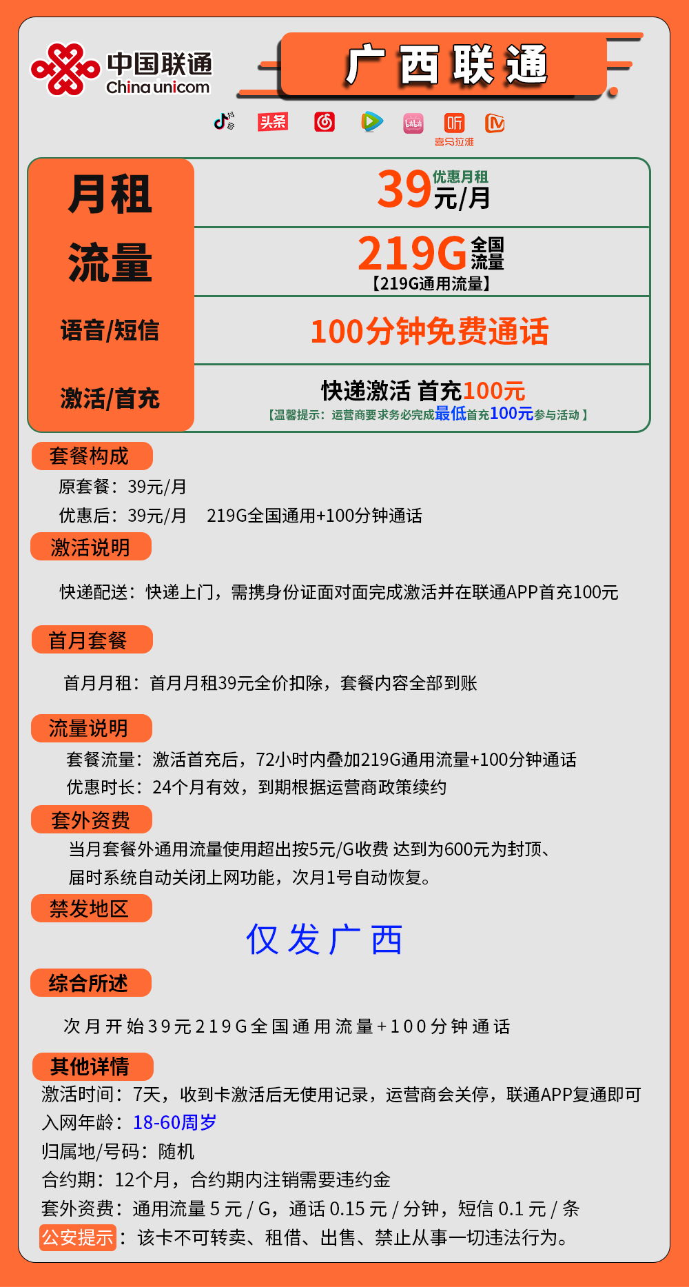 优惠后:39元/月219G全国通用+100分钟通话激活说明