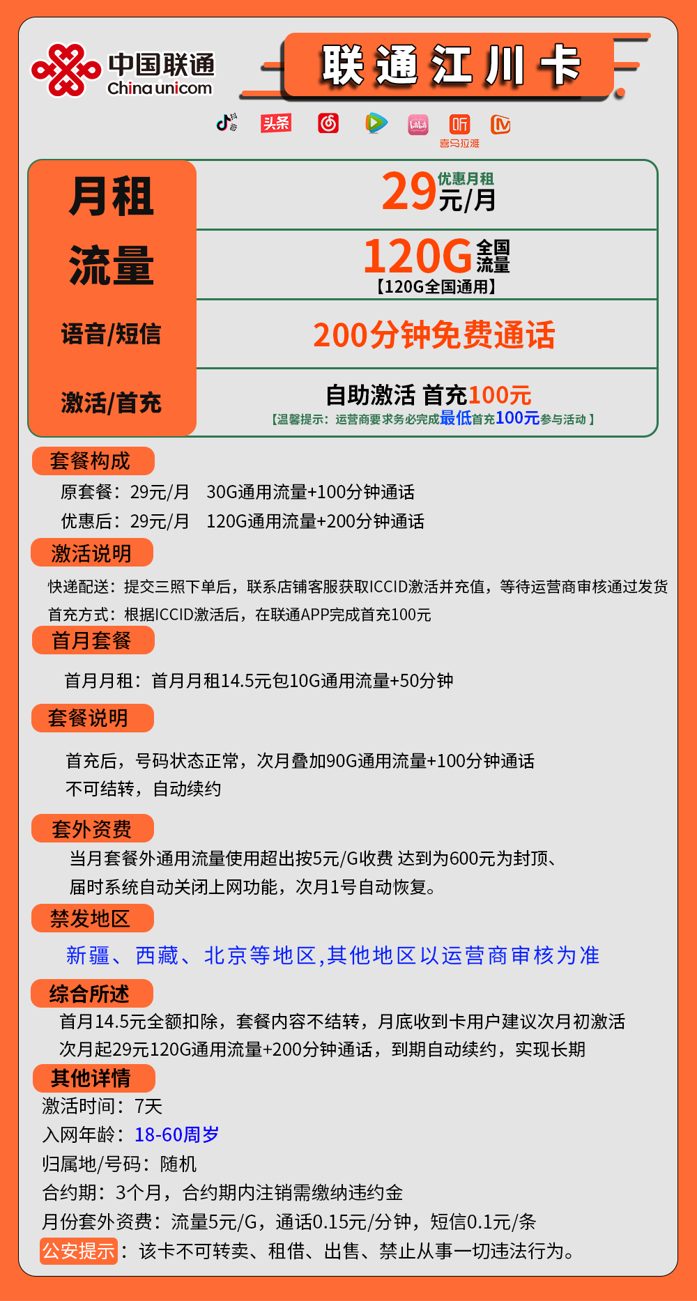 优惠后:29元/月120G通用流量+200分钟通话