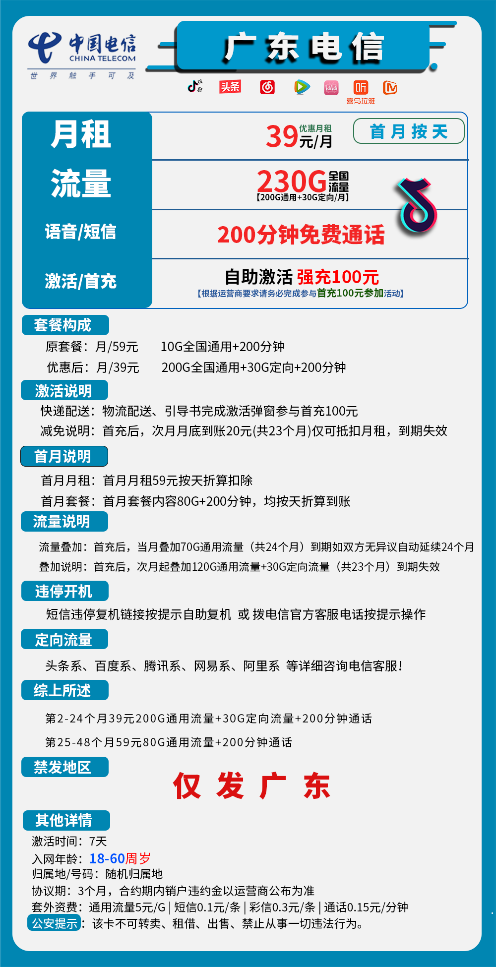 优惠后:月/39元200G全国通用+30G定向+200分钟