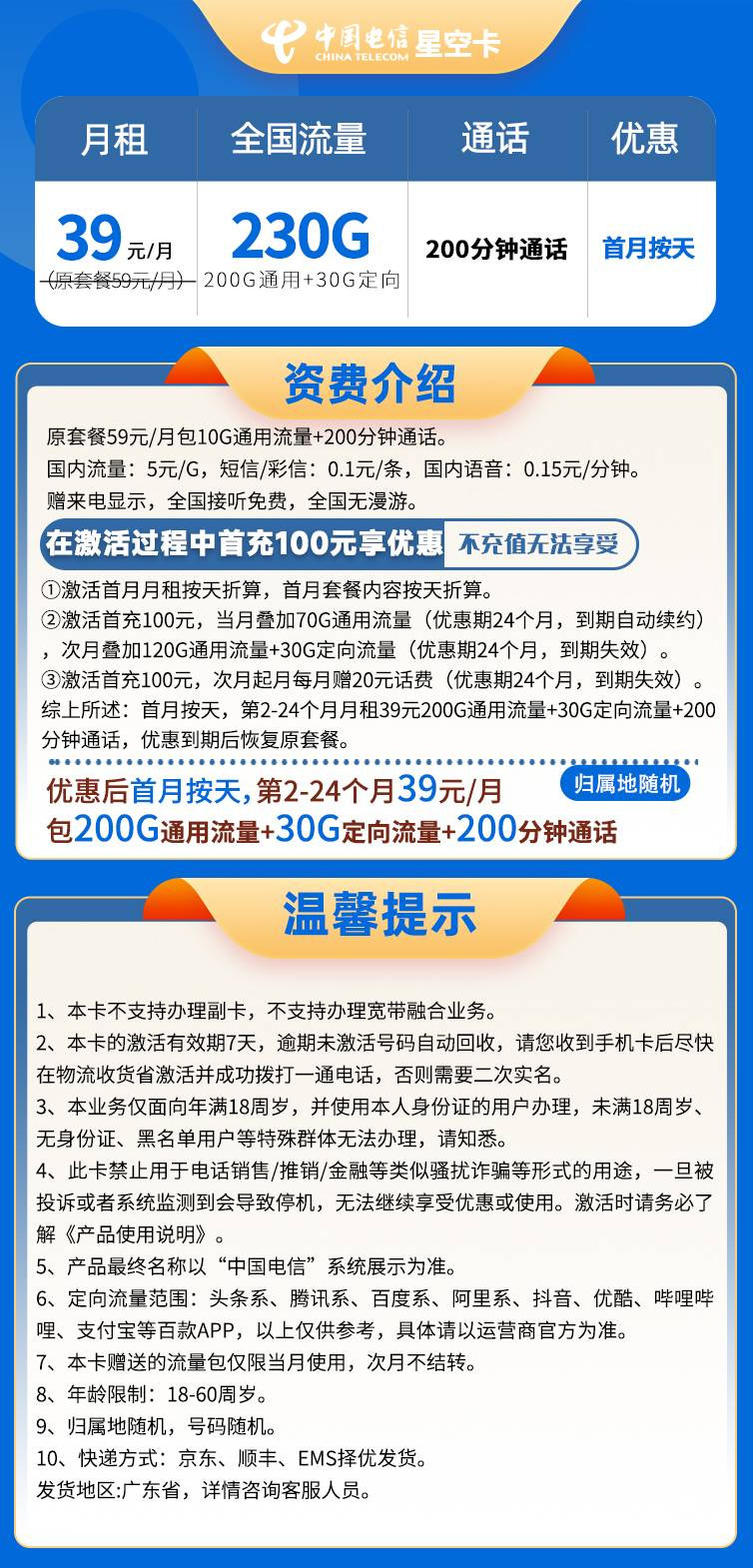 综上所述:首月按天,第2-24个月月租39元200G通用流量+30G定向流量+200分钟通话,优惠到期后恢复原套餐。