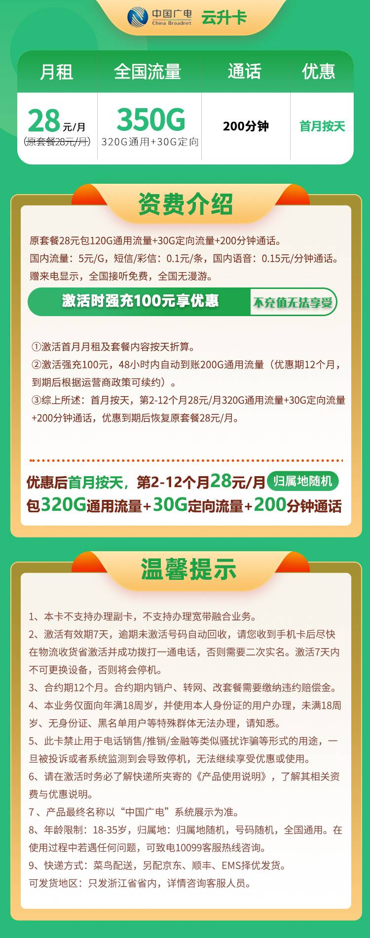 ③综上所述:首月按天,第2-12个月28元/月320G通用流量+30G定向流量+200分钟通话,优惠到期后恢复原套餐28元/月。