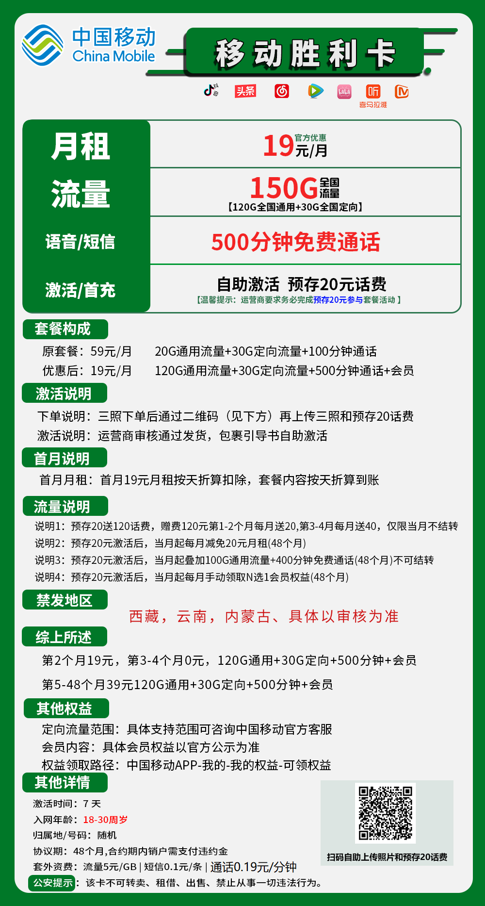 原套餐:59元/月20G通用流量+30G定向流量+100分钟通话优惠后:19元/月120G通用流量+30G定向流量+500分钟通话+会员