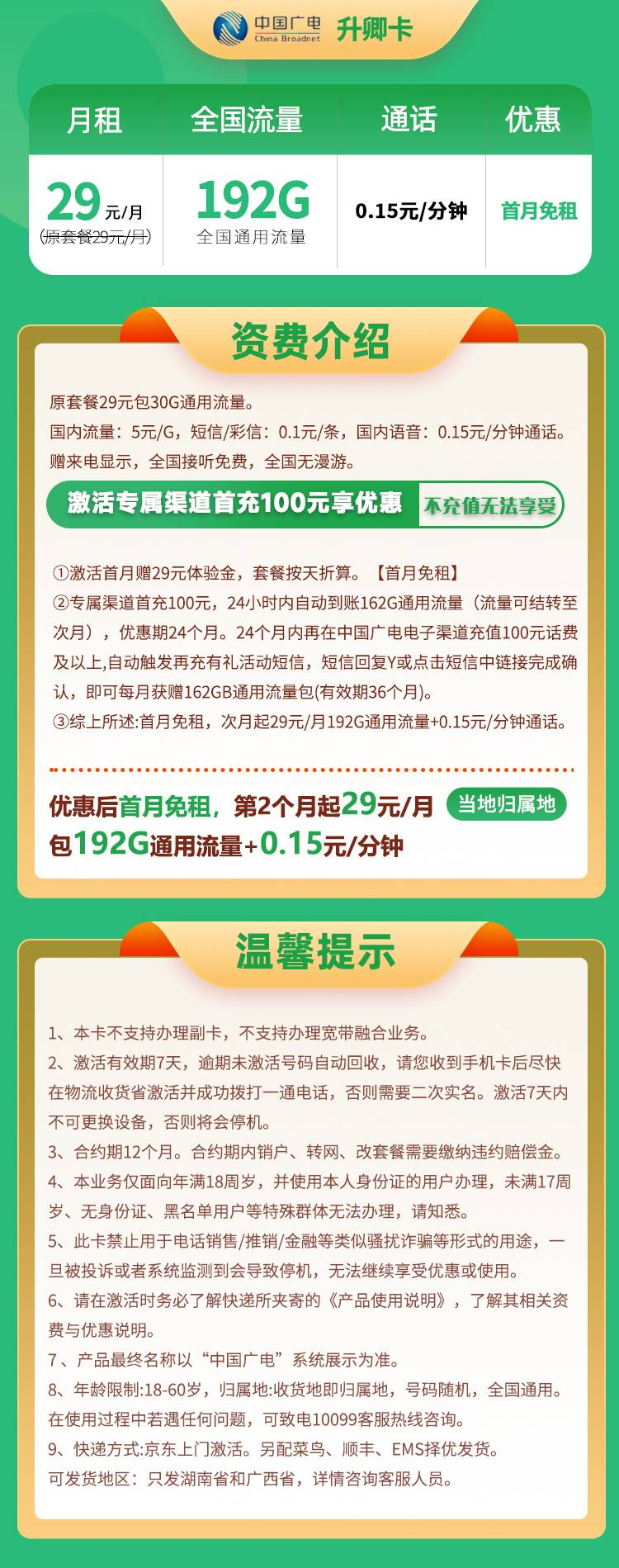 ③综上所述:首月免租,次月起29元/月192G通用流量+0.15元/分钟通话