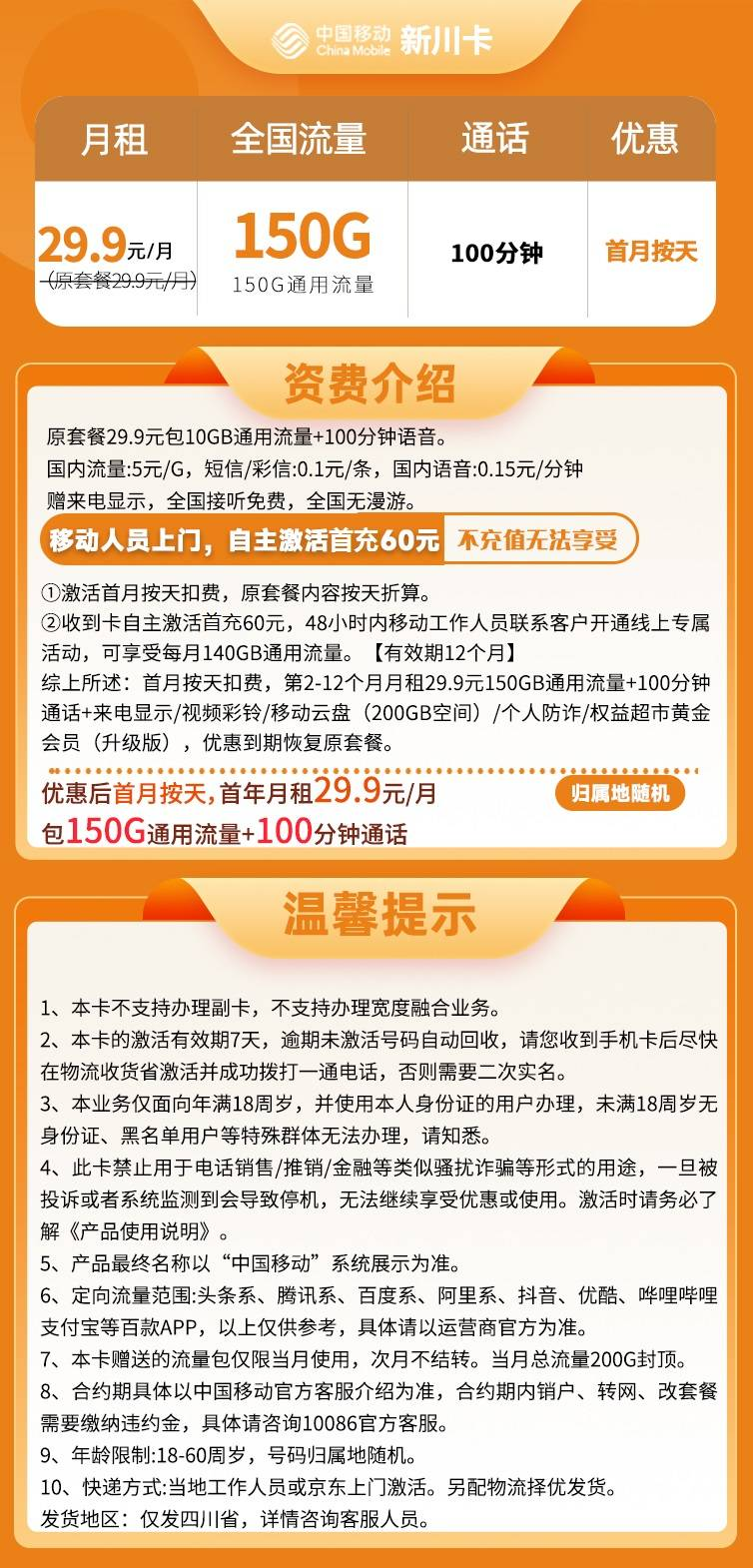 综上所述:首月按天扣费,第2-12个月月租29.9元150GB通用流量+100分钟通话+来电显示/视频彩铃/移动云盘(200GB空间)/个人防诈/权益超市黄金会员(升级版),优惠到期恢复原套餐。