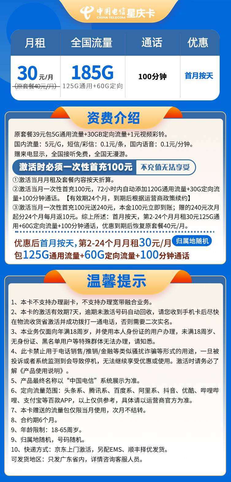 综上所述:首月按天,第2-24个月月租30元125G通用+60G定向流量+100分钟通话,优惠到期后恢复原套餐40元/月。