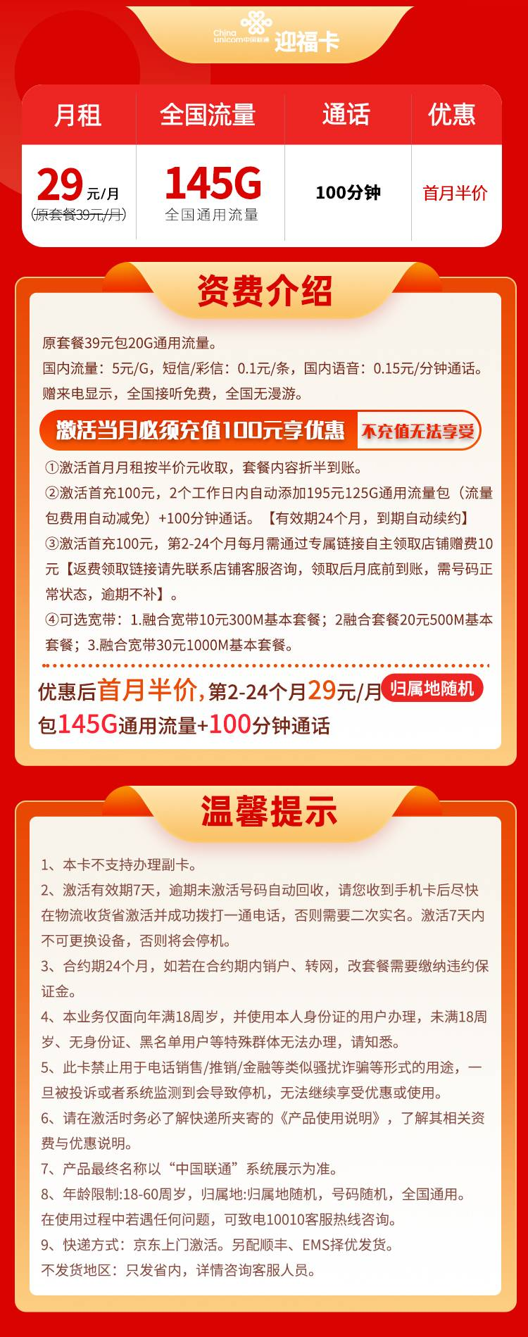 ①激活首月月租按半价元收取,套餐内容折半到账。