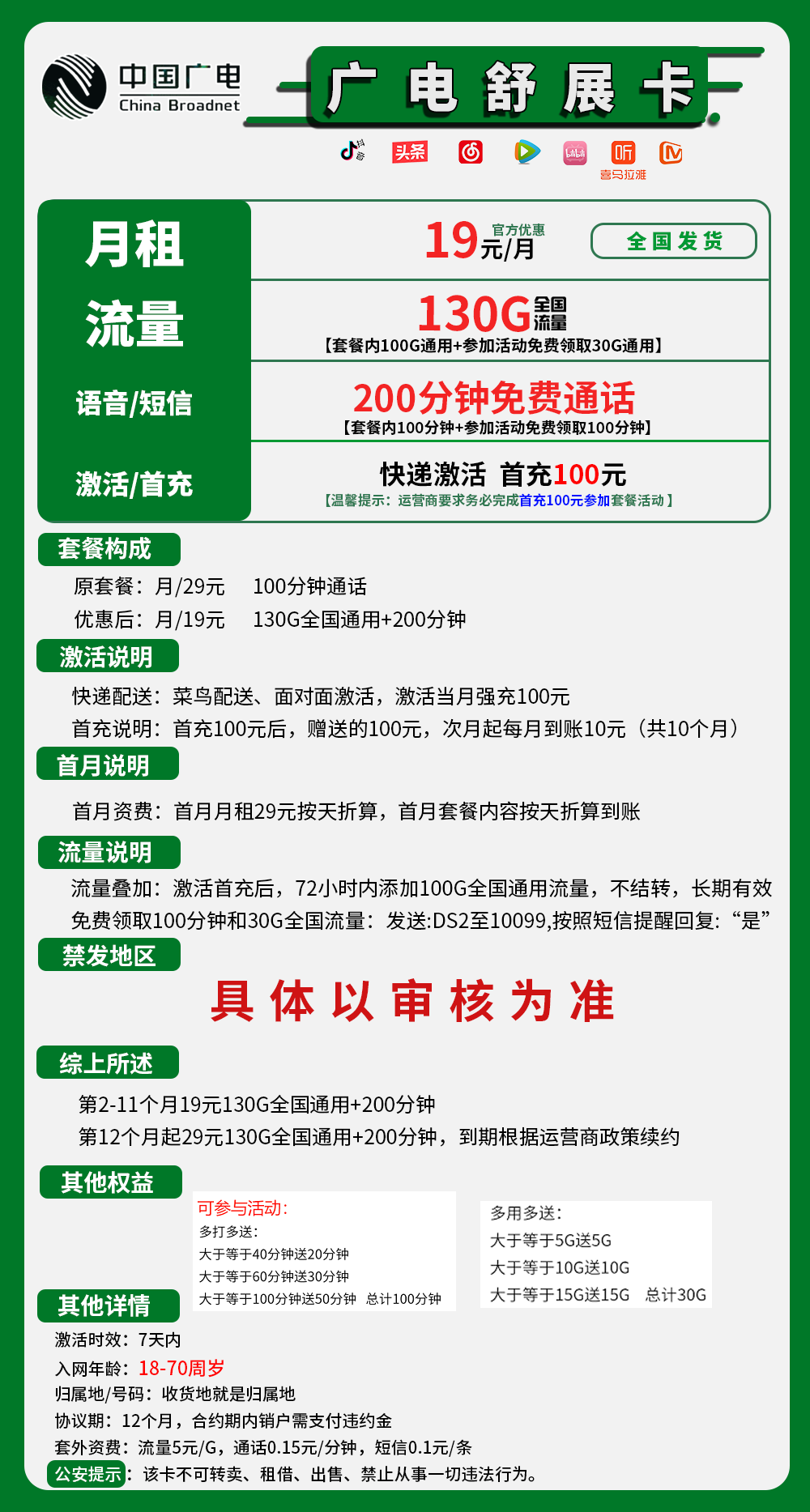 • 2026-02-04 01:52:47 • 广电 • 查看 4 91368【广电舒展卡】 类别: 通讯卡 是否实名: 需要自行实名 下单金额: 免费申请 立即免费办理 联系客服 套餐构成原套餐:月/29元优惠后:月/19元 100分钟通话 130G全国通用+200分钟激活说明快递配送:菜乌配送、面对面激活,激活当月强充100元首充说明:首充100元后,赠送的100元,次月起每月到账10元(共10个月)首月说明首月资费:首月月租29元按天折算,首月套餐内容按天折算到账流量说明流量叠加:激活首充后,72小时内添加100G全国通用流量,不结转,长期有效免费领取100分钟和30G全国流量:发送:DS2至10099,按照短信提醒回复:“是”