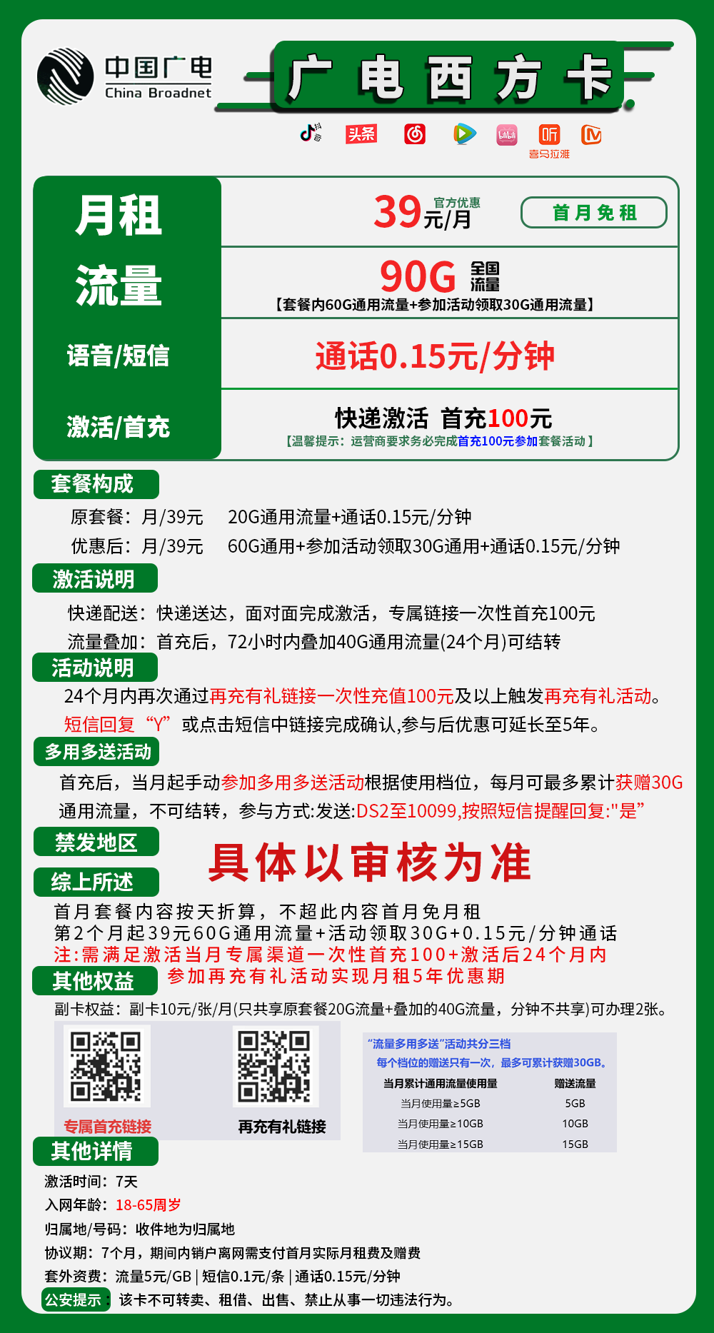 优惠后:月/39元 60G通用+参加活动领取30G通用+通话0.15元/分钟