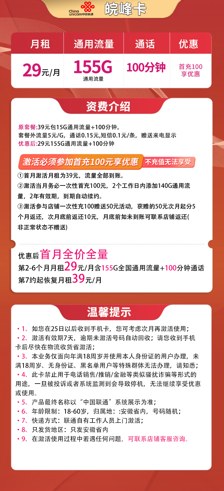 • 2026-03-18 17:10:44 • 联通 • 查看 129 联通皖峰卡29元155G通用+100分钟【只发安徽】 类别: 通讯卡 是否实名: 需要自行实名 下单金额: 免费申请 已停止办理该卡 联系客服